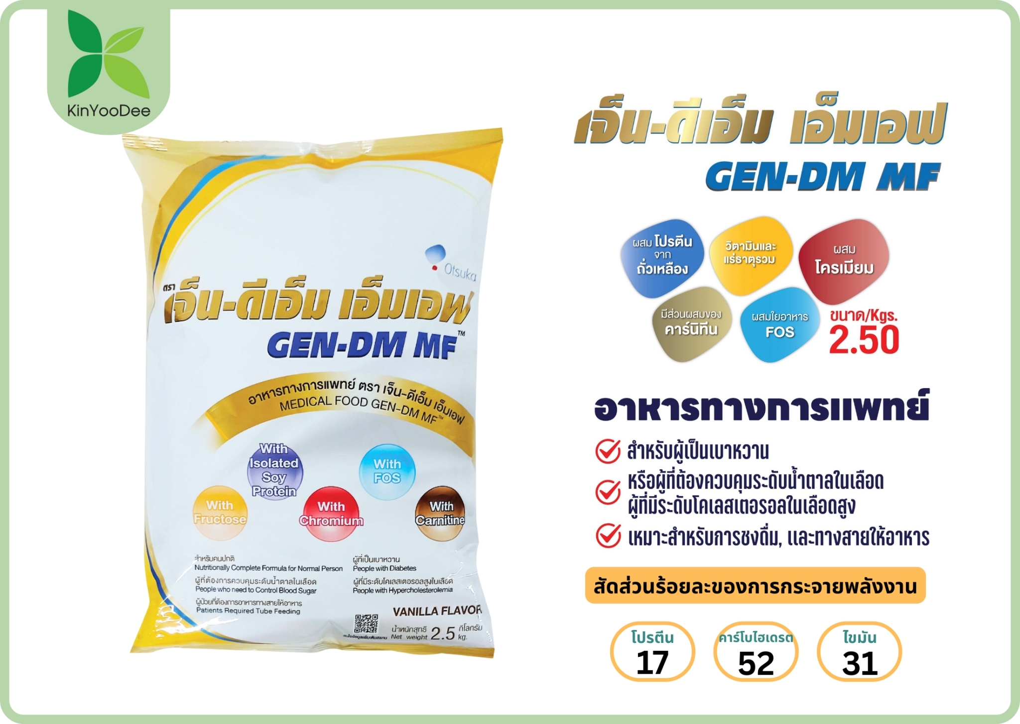 – ในการเตรียมที่ความเข้มข้น 1 กิโลแคลอรี/มล. ใช้ผง เจ็น-ดีเอ็ม เอ็มเอฟ 222 กรัม ผสมน้ำให้ครบ 1000 มล.