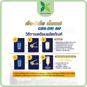 ใช้ผง เจ็น-ดีเอ็ม เอ็มเอฟ GEN-DM MF 5 ช้อนตวง (40 กรัม) เติมน้ำอุ่นครึ่งแก้ว (120 มล.) คนให้เข้ากัน เติมน้ำให้ครบ (200 มล.)